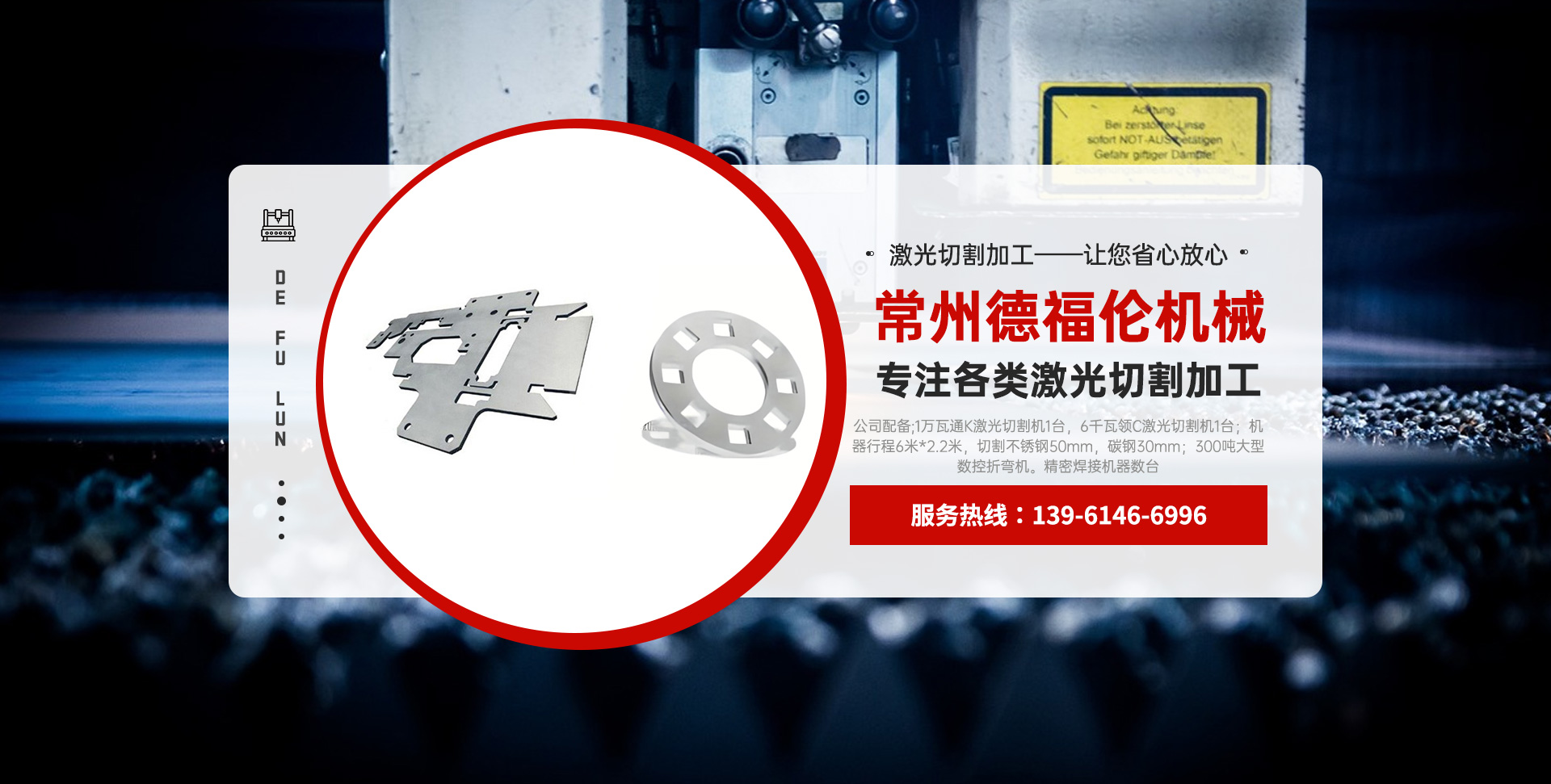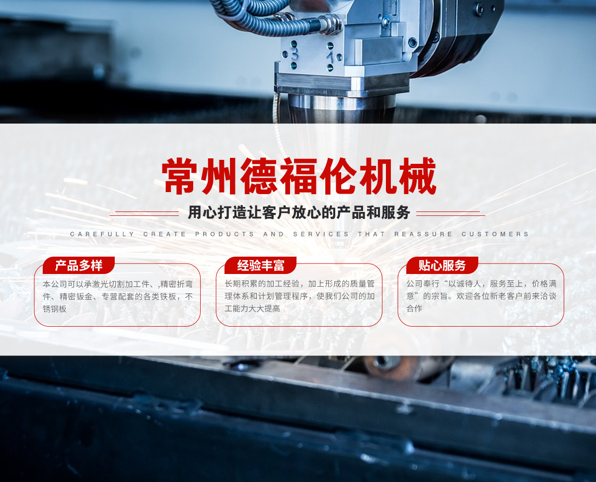 常州德福倫機(jī)械有限公司成立于2014年12月19號(hào),位于江蘇省常州市武進(jìn)區(qū)遙觀鎮(zhèn)建農(nóng)村劍童路56號(hào)西門(mén);公司配備;1萬(wàn)瓦通K激光切割機(jī)1臺(tái),6千瓦領(lǐng)C激光切割機(jī)1臺(tái);機(jī)器行程6米*2.2米,切割不銹鋼50mm,碳鋼30mm;300噸大型數(shù)控折彎?rùn)C(jī)。精密焊接機(jī)器數(shù)臺(tái)。本公司可以承激光切割加工件、,精密折彎件、精密鈑金、專(zhuān)營(yíng)配套的各類(lèi)鐵板,不銹鋼板。長(zhǎng)期積累的加工經(jīng)驗(yàn),加上形成的質(zhì)量管理體系和計(jì)劃管理程序,使我們公司的加工能力大大提高,滿足客戶所需,是我們公司的目標(biāo)!公司奉行“以誠(chéng)待人,服務(wù)為上,價(jià)格滿意”的宗旨。歡迎各位領(lǐng)導(dǎo);老總前來(lái)洽談合作!